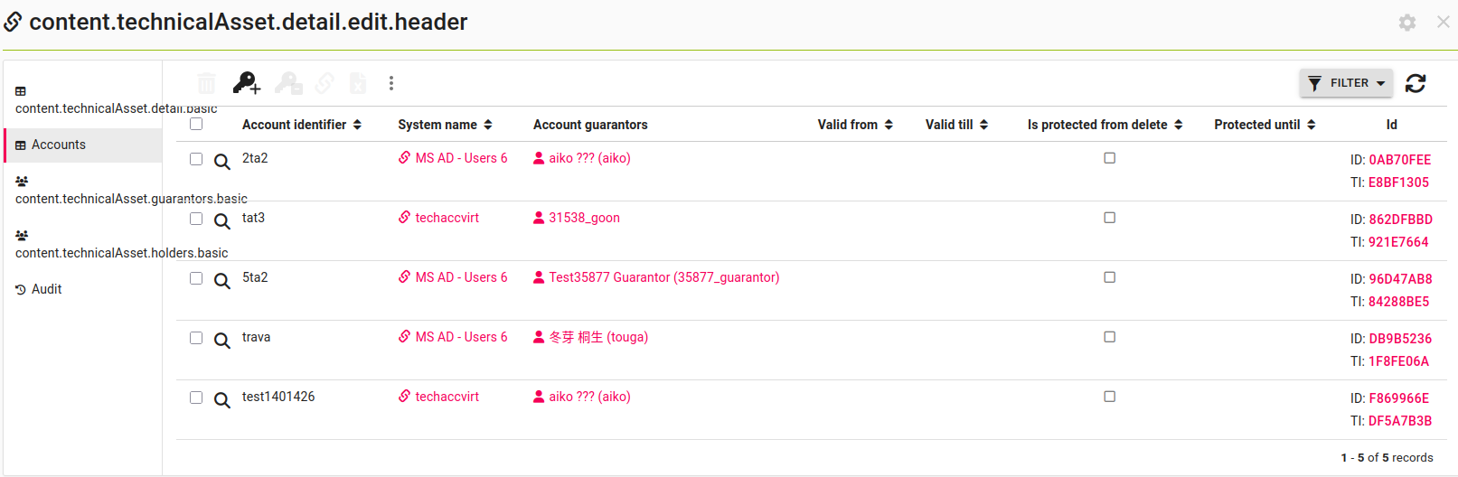 If you want to see all the technical accounts that belong to a technical asset, you can use the Accounts tab of a technical asset detail. The table shown here has all the filtering features of the standard technical accounts table.